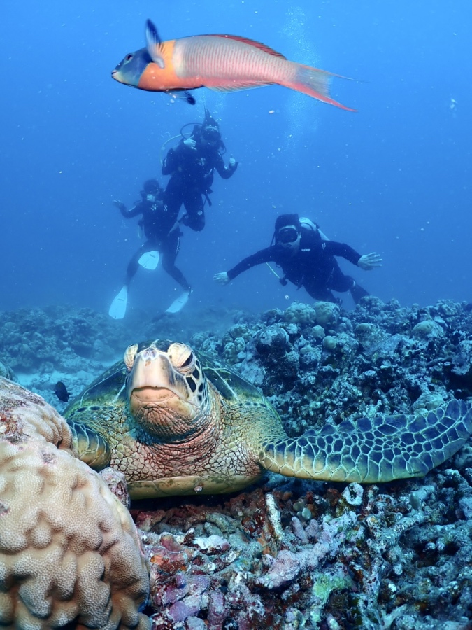 お二人ともダイビングもすごく上手で、私のアシストなしでスイスイ泳いでウミガメのところへ。