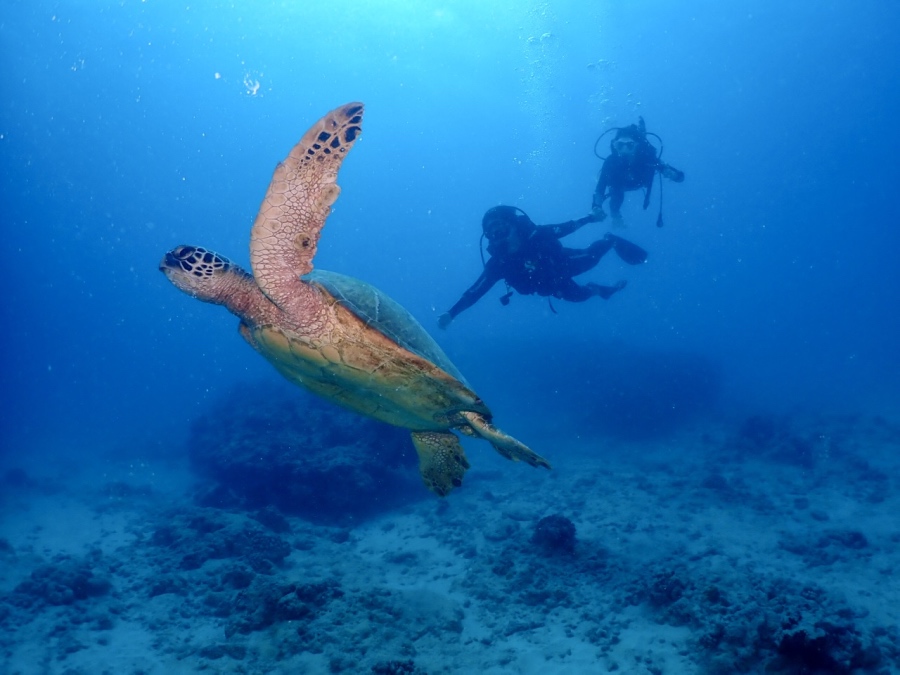 みなさんすごく上手で1ダイブ目からウミガメのいるリーフへ行けて、長い間ウミガメと一緒にいることができました。