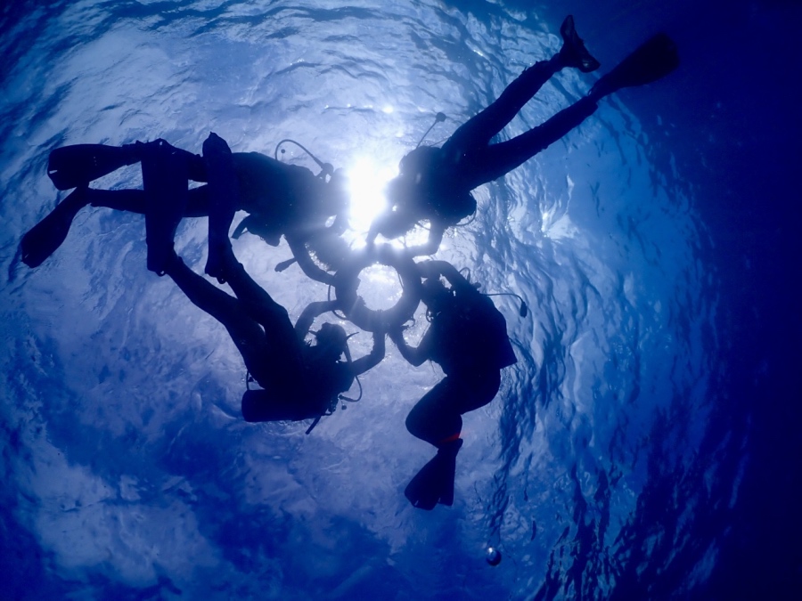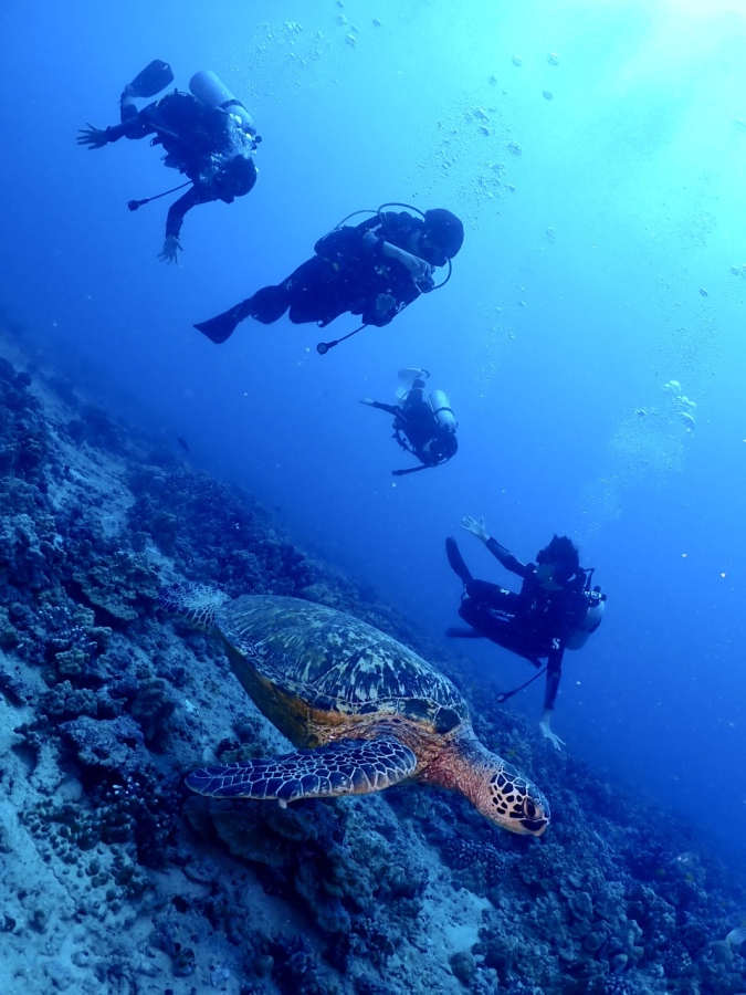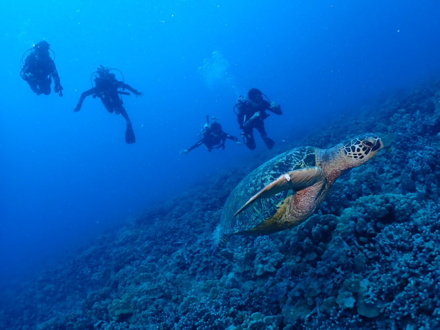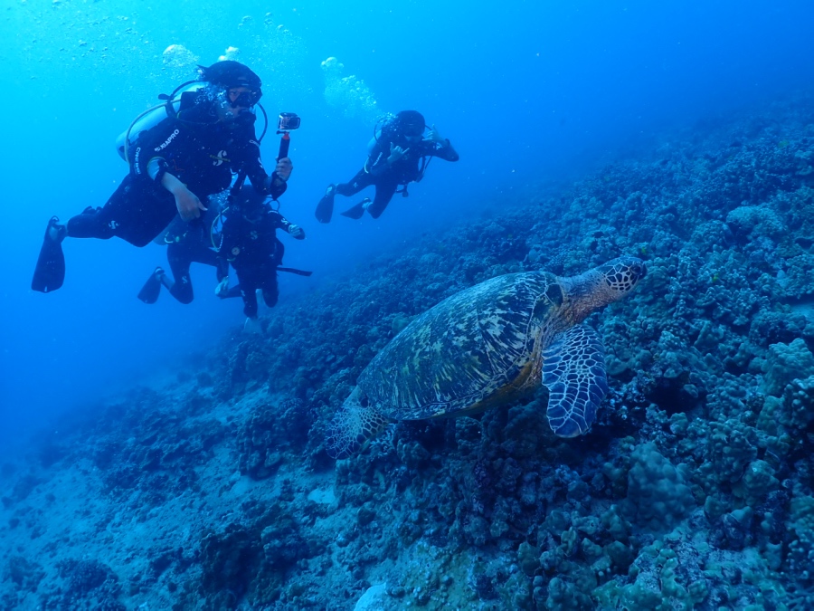 3人が未経験者でしたが、すごく上手に泳げて練習もそこそこにして。1ダイブ目からウミガメのいるリーフへ。