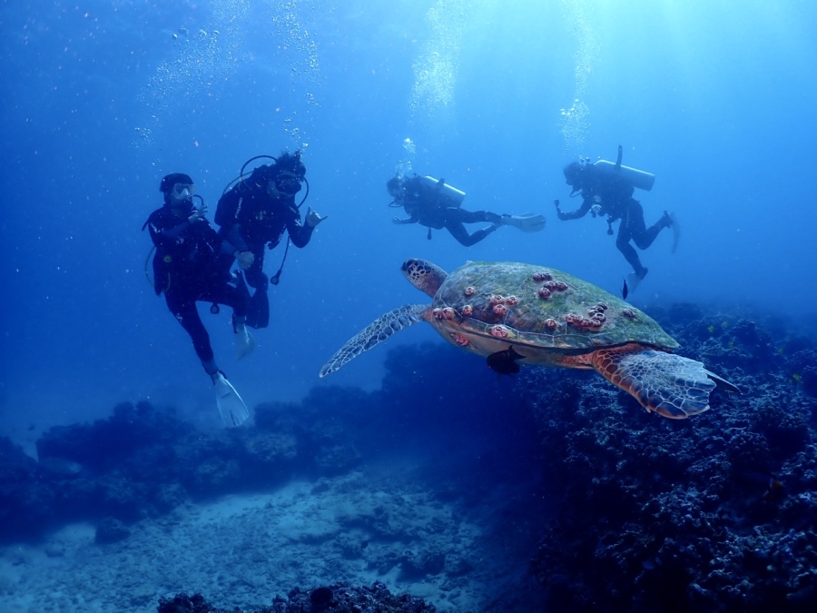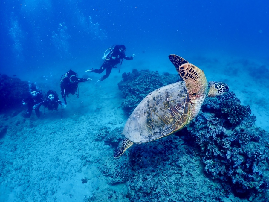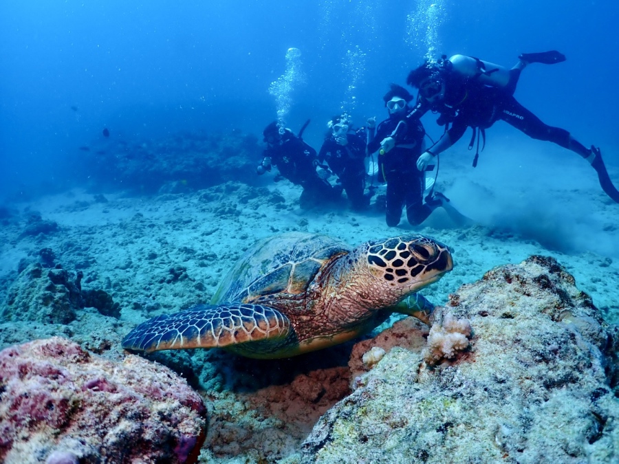 1ダイブ目はしっかりダイビングスキルの練習をしていただき、2ダイブ目にシークレットリーフまで行き、ウミガメと一緒に泳ぐことができました。