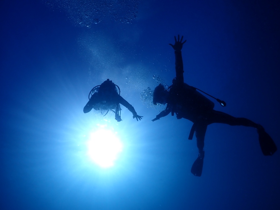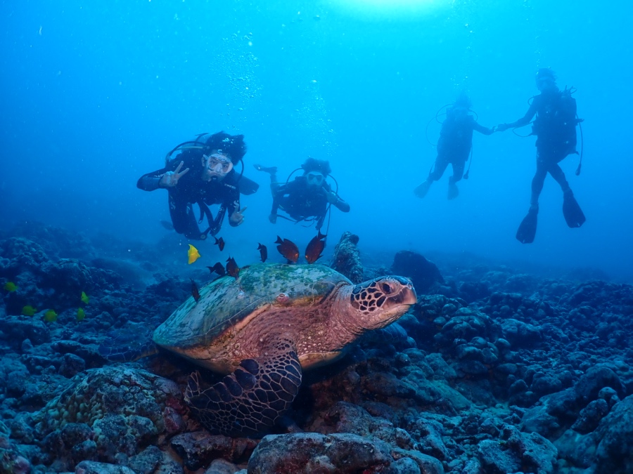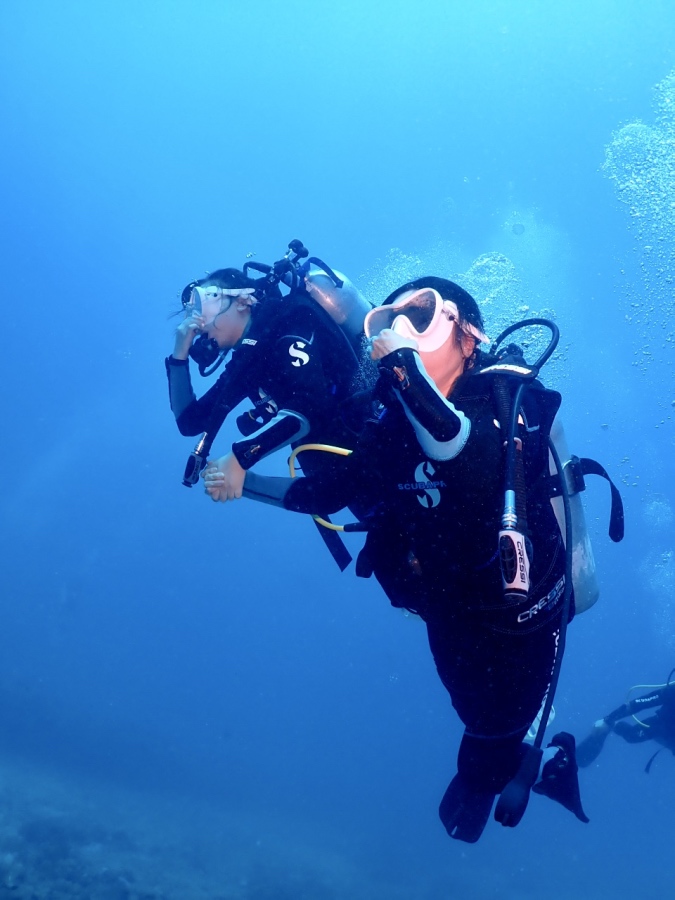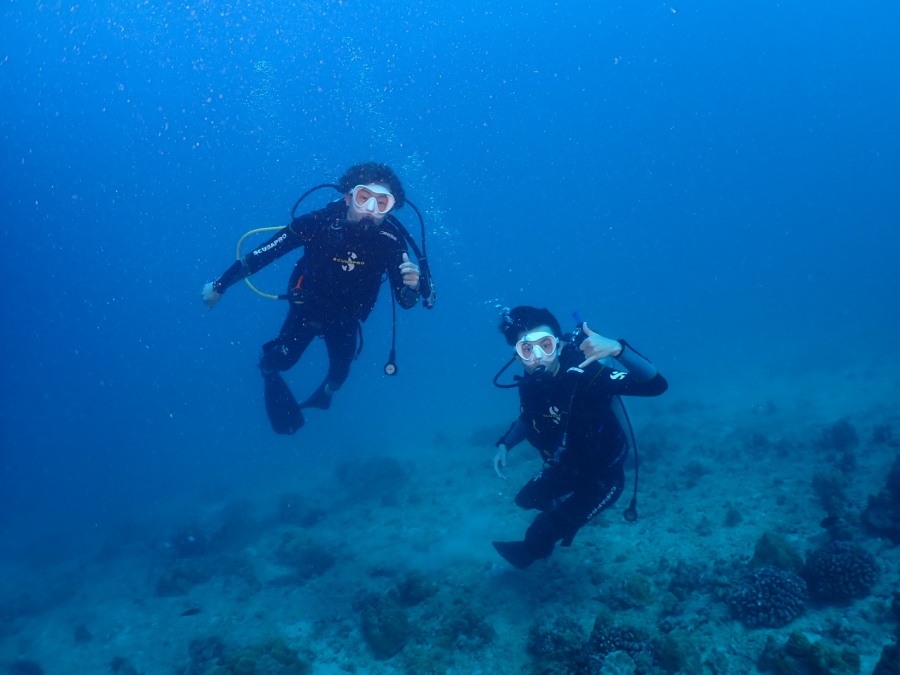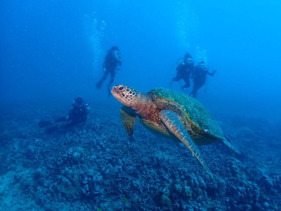 なかなか耳抜きがうまくいかず、苦戦しましたが、無事2ダイブ目にウミガメと出会えて、一緒に泳いで楽しんでいただけました。