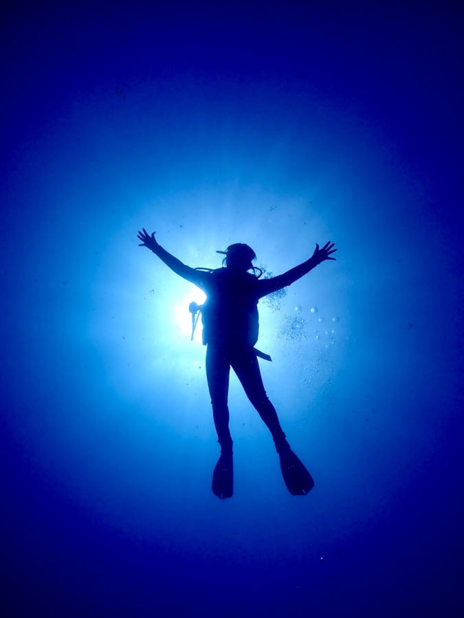 ダイビングの締めくくりは、ハワイの強い日差しを活かしたシルエットフォト。 太陽に向かって手を広げる姿は、開放感たっぷり!一生の思い出に残る、アートのような一枚が撮れました。