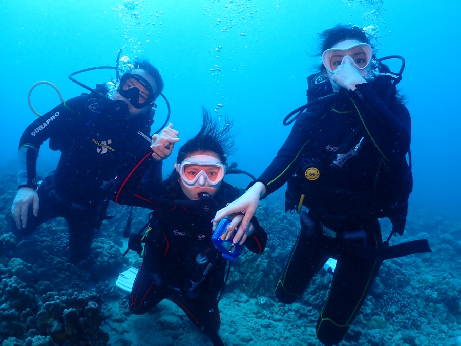 水中でもこの笑顔!初めてのダイビングとは思えないほど、皆様リラックスして楽しまれていました。 ホロホロ・オーシャン・ダイバーズでは、ベテランガイドが安全を第一にサポートしますので、初心者の方はもちろん、お子様連れのご家族も安心してご参加いただけます。