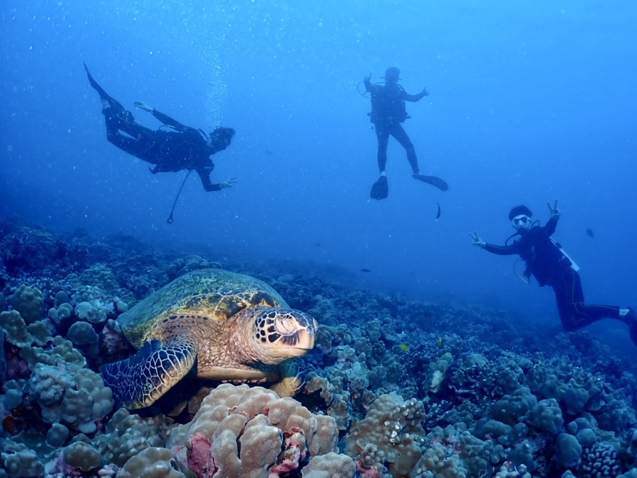 潜降してすぐに、ハワイのアイドル・ウミガメ(ホヌ)が登場! 体験ダイビングとは思えないほどの至近距離で、優雅に泳ぐ姿を観察できました。お客様も、目の前を通り過ぎるカメの迫力に驚きつつ、水中で上手にサインを送ってくれました。