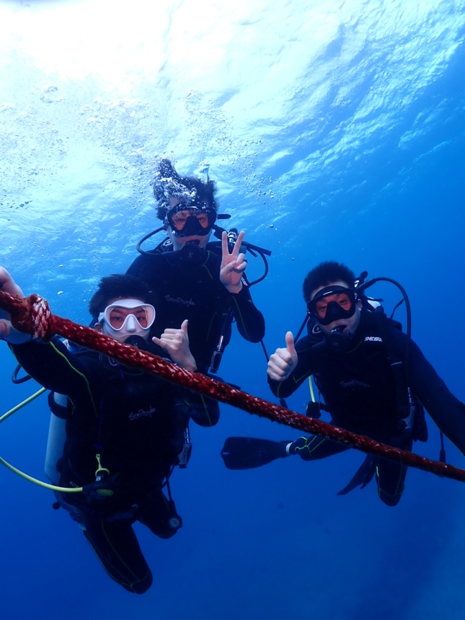 「泳ぎに自信がない…」という方も大丈夫! エントリー直後はロープをしっかり掴んで、耳抜きのペースを確認しながらゆっくりと潜っていきます。この日のお客様も、後半にはすっかりリラックスして、余裕のピースサインを見せてくれました。