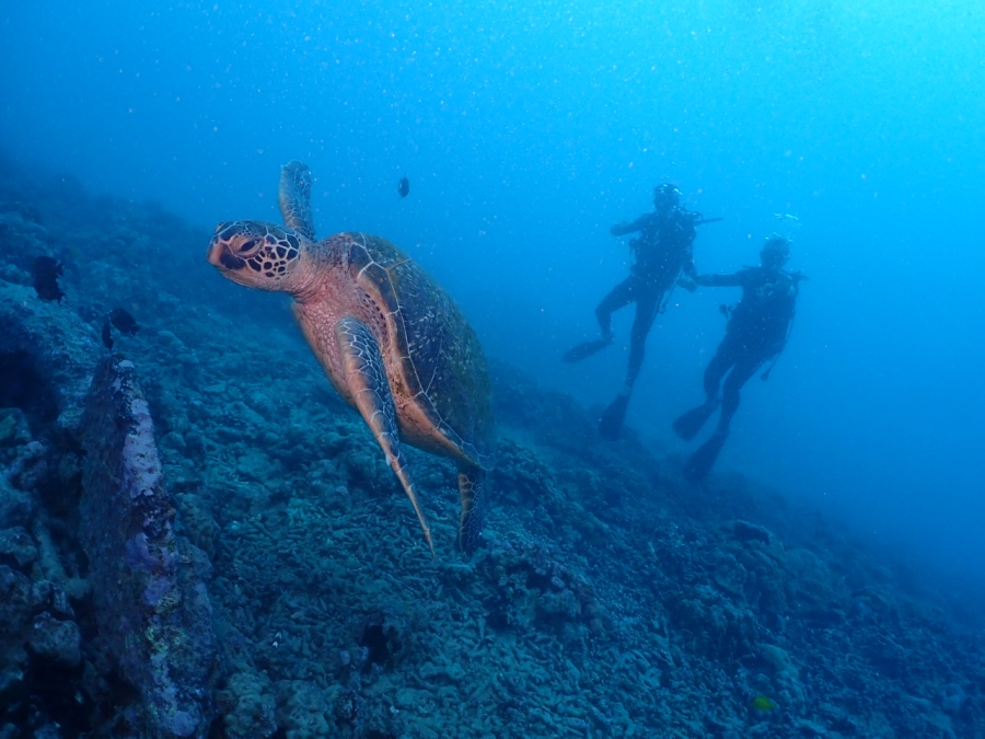 少し泳いでウミガメの集まるポイントへ到着すると……さっそく立派なアオウミガメ(ホヌ)が登場です!ダイバーのお二人のすぐ目の前を、ゆったりと自分のペースで泳いでいきます。まるでウミガメがお二人をハワイの海へ歓迎してくれているかのようですね。ボートダイビングならではのダイナミックなウミガメとの出会いに、お二人とも大感動のご様子でした。