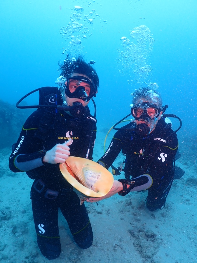 これは「トウカムリ」という種類の巻貝です。お二人の顔の大きさと比べても、その巨大さがよくわかりますよね。実際に手で触れて、その重さや質感を確かめられるのもダイビングならではの面白い体験です。海の不思議な生き物との出会いに、大人も子供も大興奮の瞬間でした。