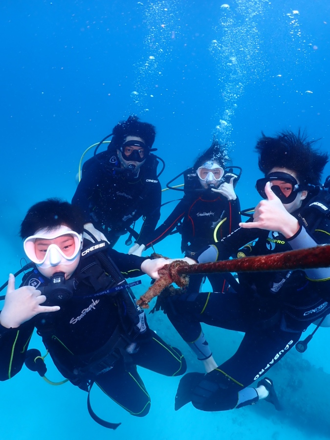 体験ダイビングでも、日本人インストラクターが丁寧にサポートするので、このように水中でリラックスして楽しむことができます。家族みんなで同じ景色を見て、感動を共有できるのは、本当に素敵な思い出になります。