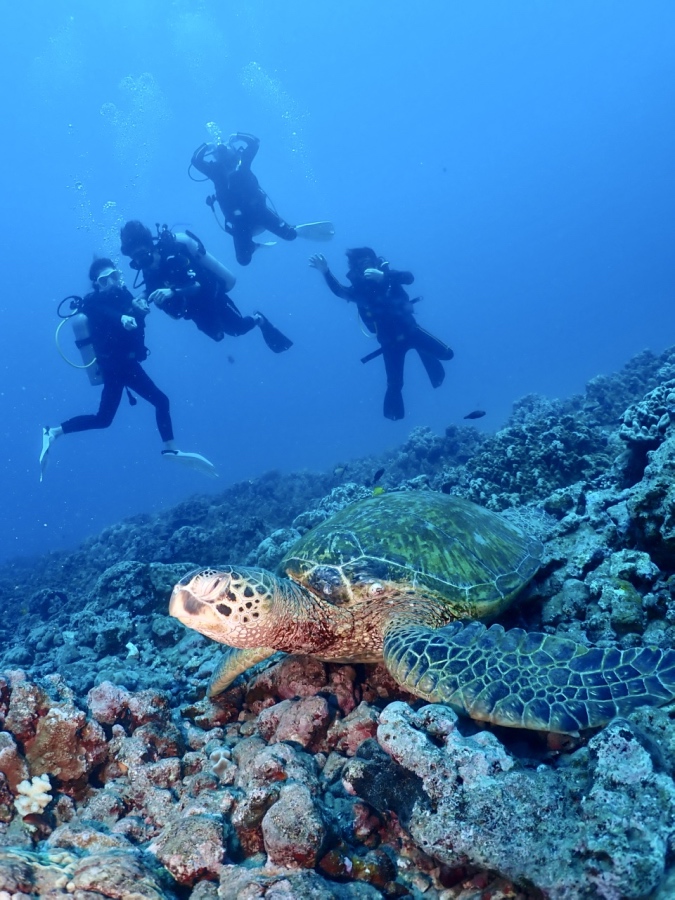 カメラ目線のホヌと、背後に浮かぶ家族4人のダイバー。これぞハワイのダイビング!という瞬間です。このシーンを見て、お子様たちも大興奮でした!
