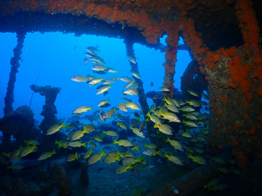 沈没船の内部は、魚たちの絶好の住処になっています。構造物の隙間には、鮮やかな黄色いラインが美しい「ヨスジフエダイ」が大きな群れを作っていました!ハワイアンブルーの海に、真っ赤な付着生物、そして黄色の魚たちのコントラストが非常に美しく、息を呑む絶景です。