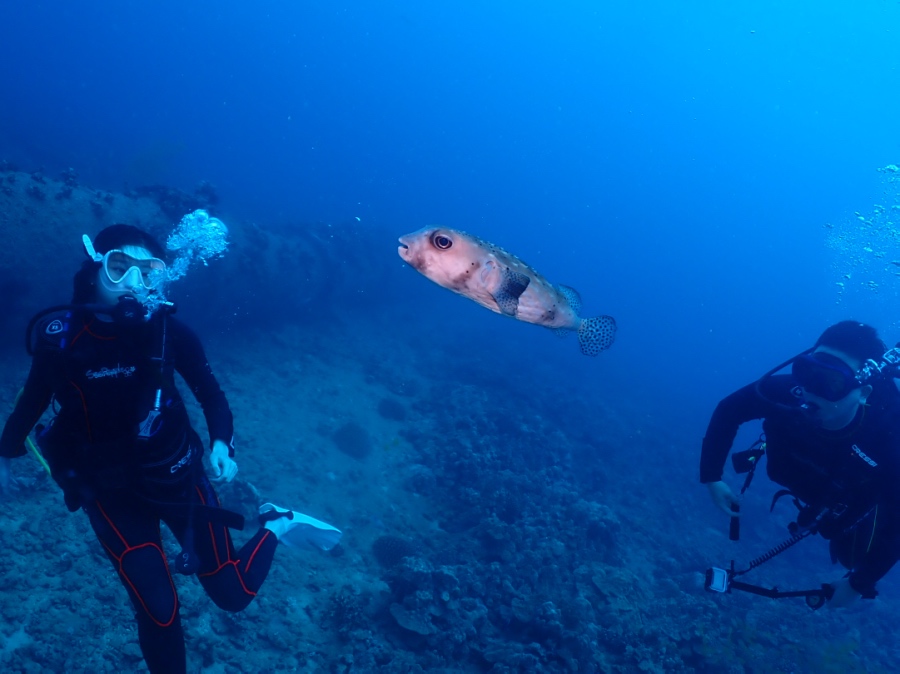 水中で泳いでいると、なんとも愛嬌のあるお顔の魚が近寄ってきました!こちらはハリセンボンの仲間、「イシガキフグ」です。クリクリの目でこちらを見つめる姿に、ダイバーのお二人も思わず笑顔に。ハワイの魚たちはダイバーに慣れている子が多く、こんな至近距離で観察できることもあります。